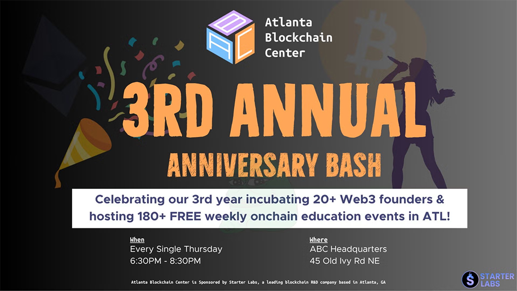 This week at Off the Chain Thursday, the Atlanta Blockchain Center is throwing a special edition celebration — its 3rd Annual Anniversary Bash!