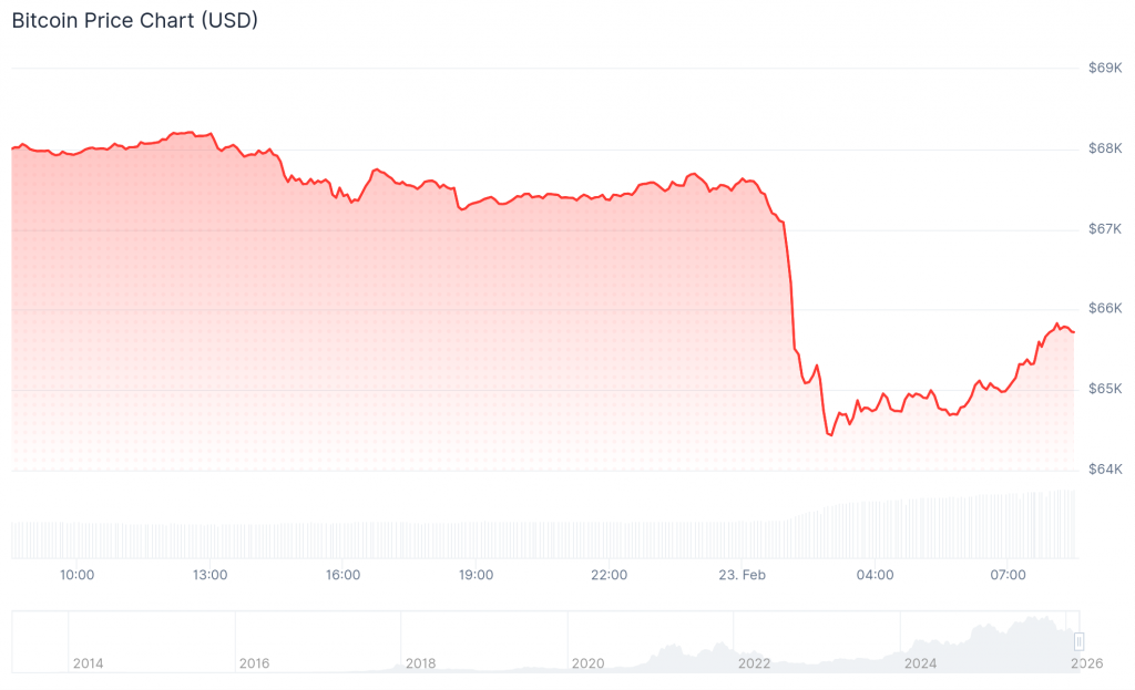 Bitcoin (BTC) fell as much as 4.8% in early Asian trading on Monday, touching $64,300 — its lowest level since February 6 — as renewed turbulence in U.S. trade policy compounded an already fragile risk environment. The move erased another $100 billion in total crypto market value within a 24-hour window, according to CoinGecko data, deepening a selloff that has now wiped more than $2 trillion from the broader digital asset market since its peak. By 9am CET, Bitcoin had partially recovered to around $65,950, though sentiment remained acutely negative across both crypto and traditional markets.