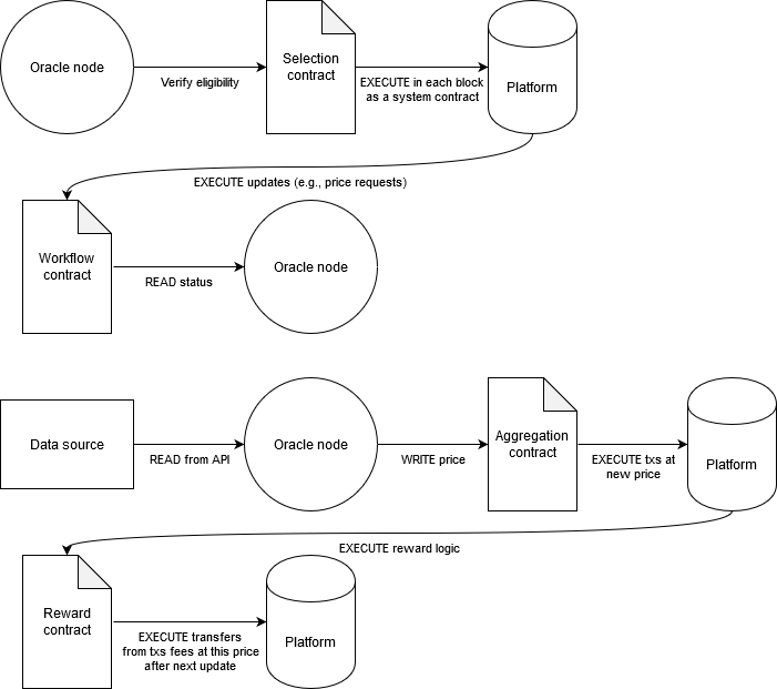 The protocol will integrate the Chainlink network of oracles through a group of such contracts. A workflow contract will be read by oracles to see if any updates have been requested by the platform. These requests will come at regular intervals. The oracle node software will then request the necessary data from exchange or data aggregator APIs, and record it on the CasperLabs blockchain, receiving a fair payment in LINK for their efforts.