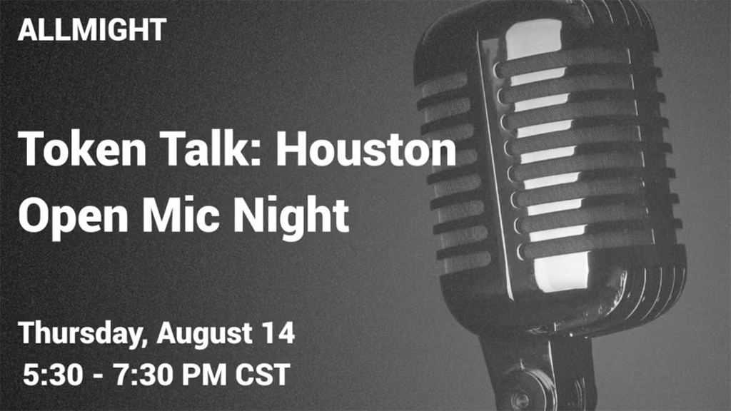 Join us Thursday, August 14th from 5:30–7:30 PM CST for Token Talk: Houston Open Mic Night – a fresh take on crypto networking where YOU take the stage.