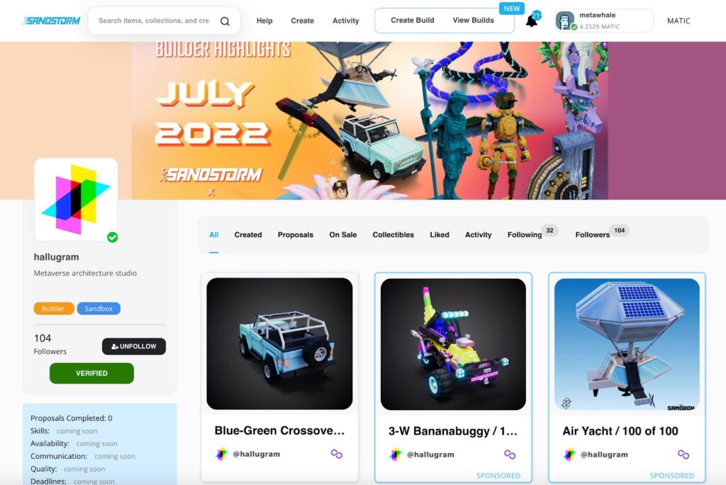 The SandStorm platform highlights builders based on Skills, Availability, Communication, Quality, Deadlines, and Team Cooperation. It can be analogized to building a dream home in the physical world, but instead of hiring one local real estate development firm, choosing the best architect in Korea, the best roofer in London, and the best electrician in Canada. Operating in the virtual world, brands can select contractors based on their portfolio of previous work.