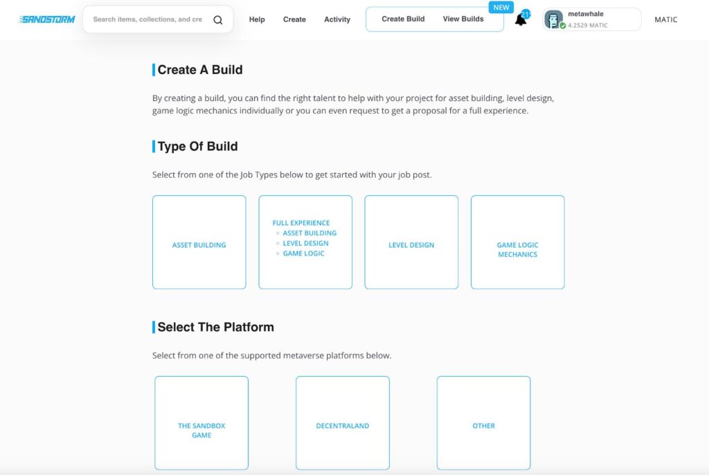 Brands can submit a proposal to create an experience in The Sandbox, Decentraland, and soon five additional virtual worlds. Individual builders and development studios from all over the world then place bids using their SandStorm profile. Brands can then select their desired team with the guidance of SandStorm.